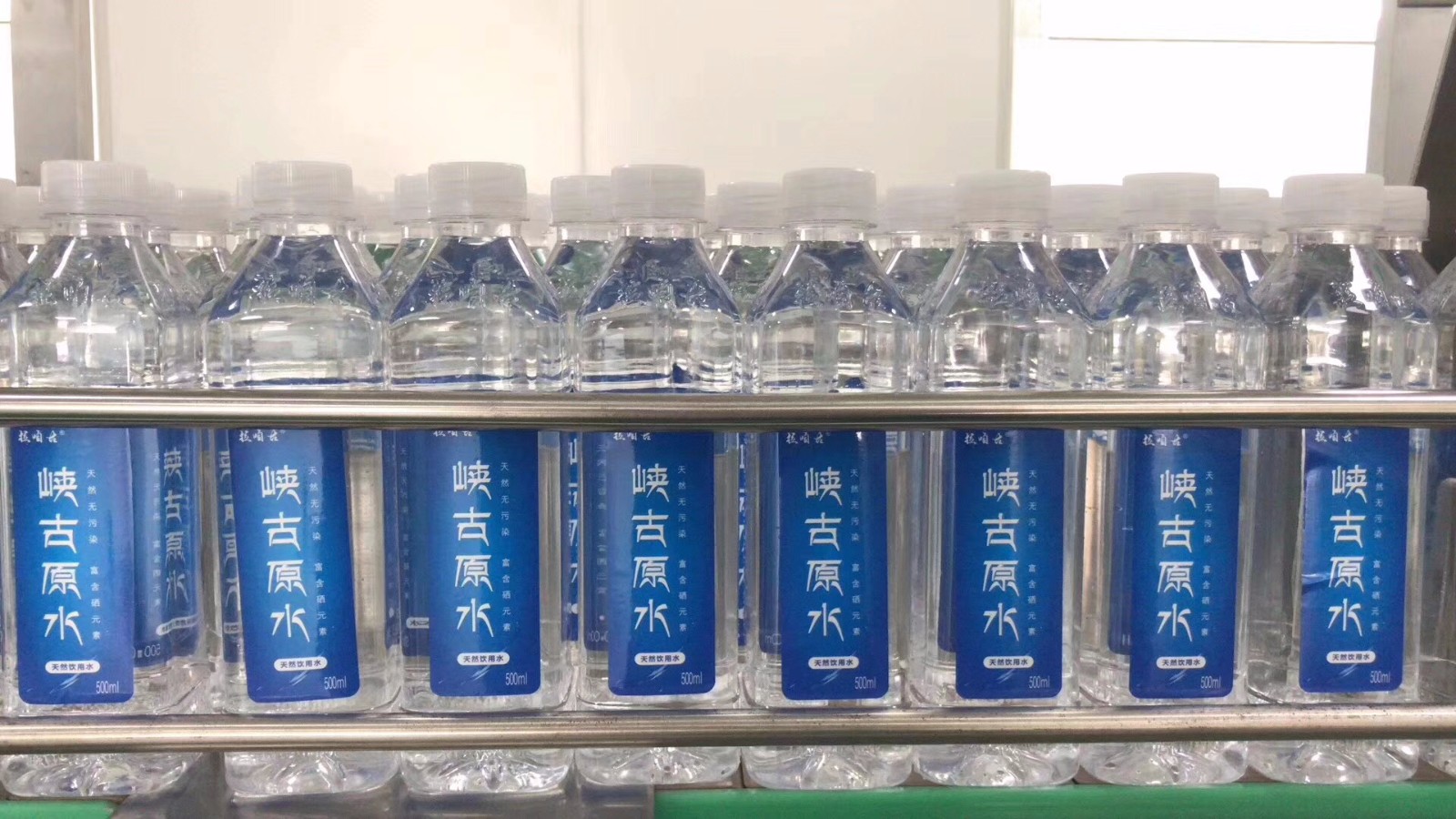 峽古原水的瓶裝水在灌裝設(shè)備上完成灌裝后由設(shè)備碼放整齊等待進入膜包機,進行封膜包裝!